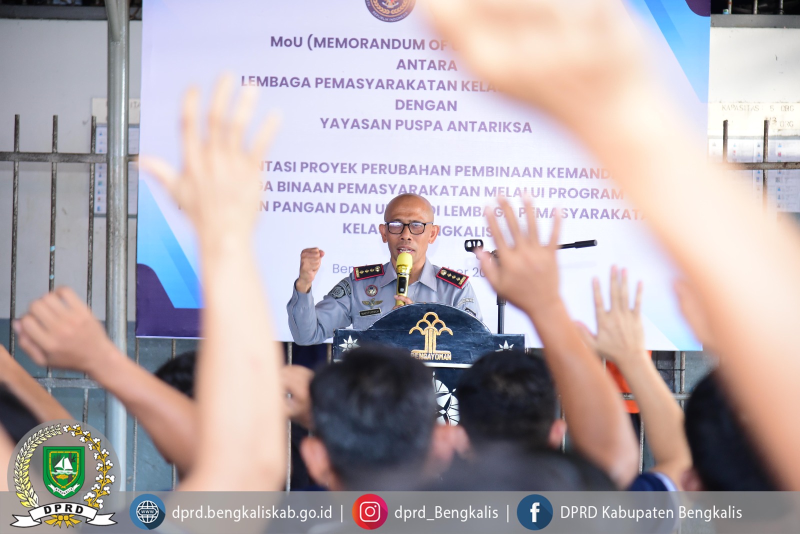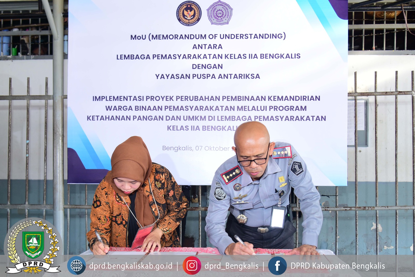 Bengkalis, Humas DPRD – Sekretaris Komisi II DPRD Kabupaten Bengkalis, Rindra Wardana atau yang akrab disapa Iyan Kancil, menghadiri penandatanganan Nota Kesepakatan (MoU) antara Lembaga Pemasyarakatan (Lapas) Kelas II A Bengkalis dengan Lembaga Pelatihan Kerja Yayasan Puspa Antariksa, Selasa (07/10/2025).