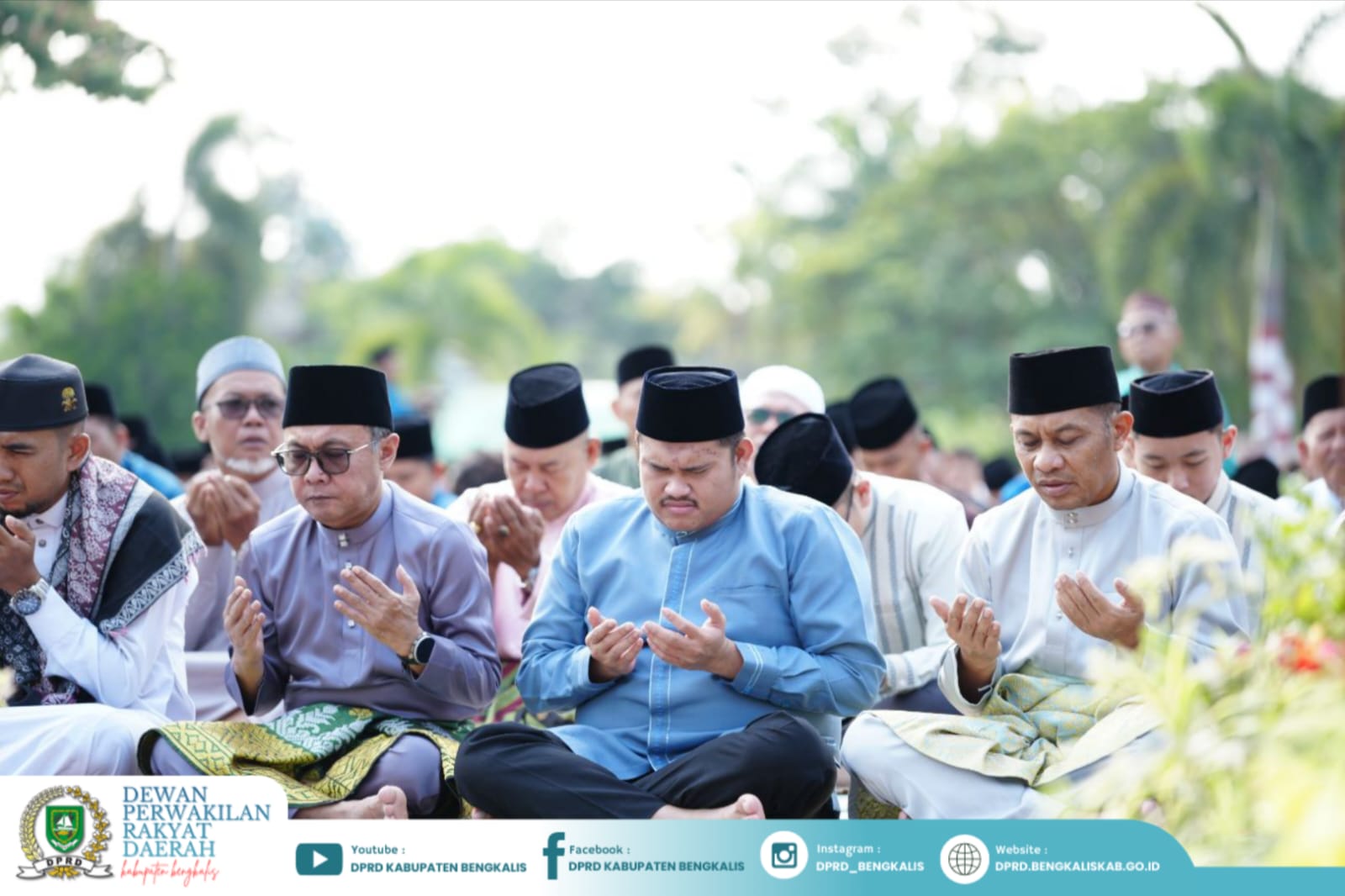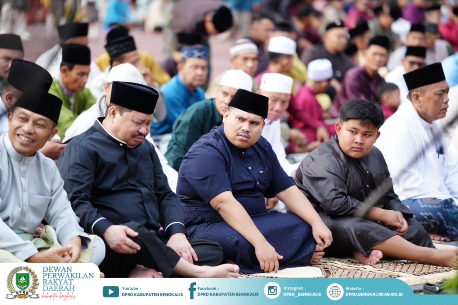 Bengkalis, Humas DPRD - Pimpinan DPRD Kabupaten Bengkalis Septian Nugraha dan M. Arsya Fadillah, turut melaksanakan Shalat Idul Fitri 1447 Hijriah bersama Bupati Bengkalis, Kasmarni, di Lapangan Tugu Bengkalis, Sabtu (21/3/2026).